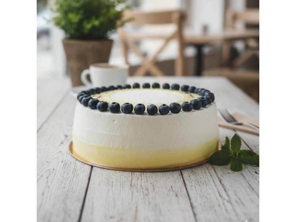 Světlý citronový korpus promazaný citonovým a borůvkovým krémem,čerstvé borůvky.